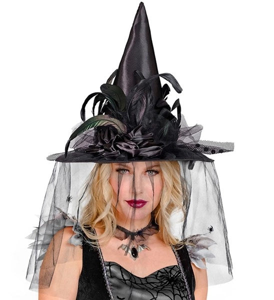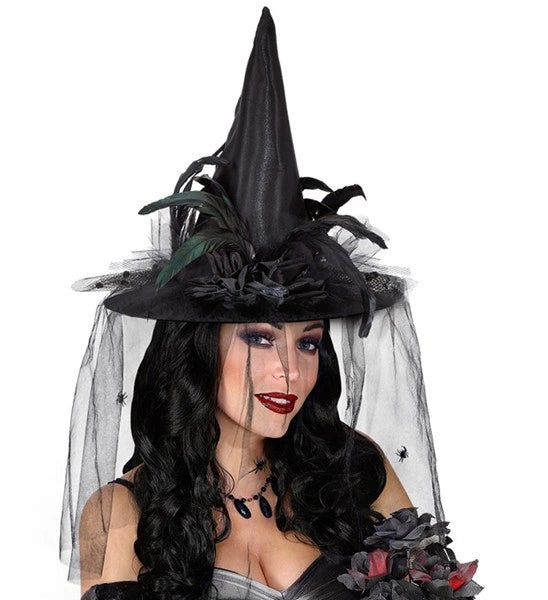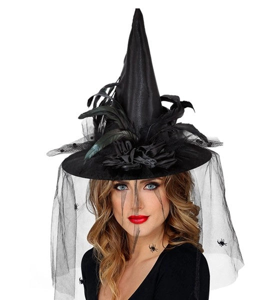 Hexenhut mit Tüll, Blumen und Federn Mats