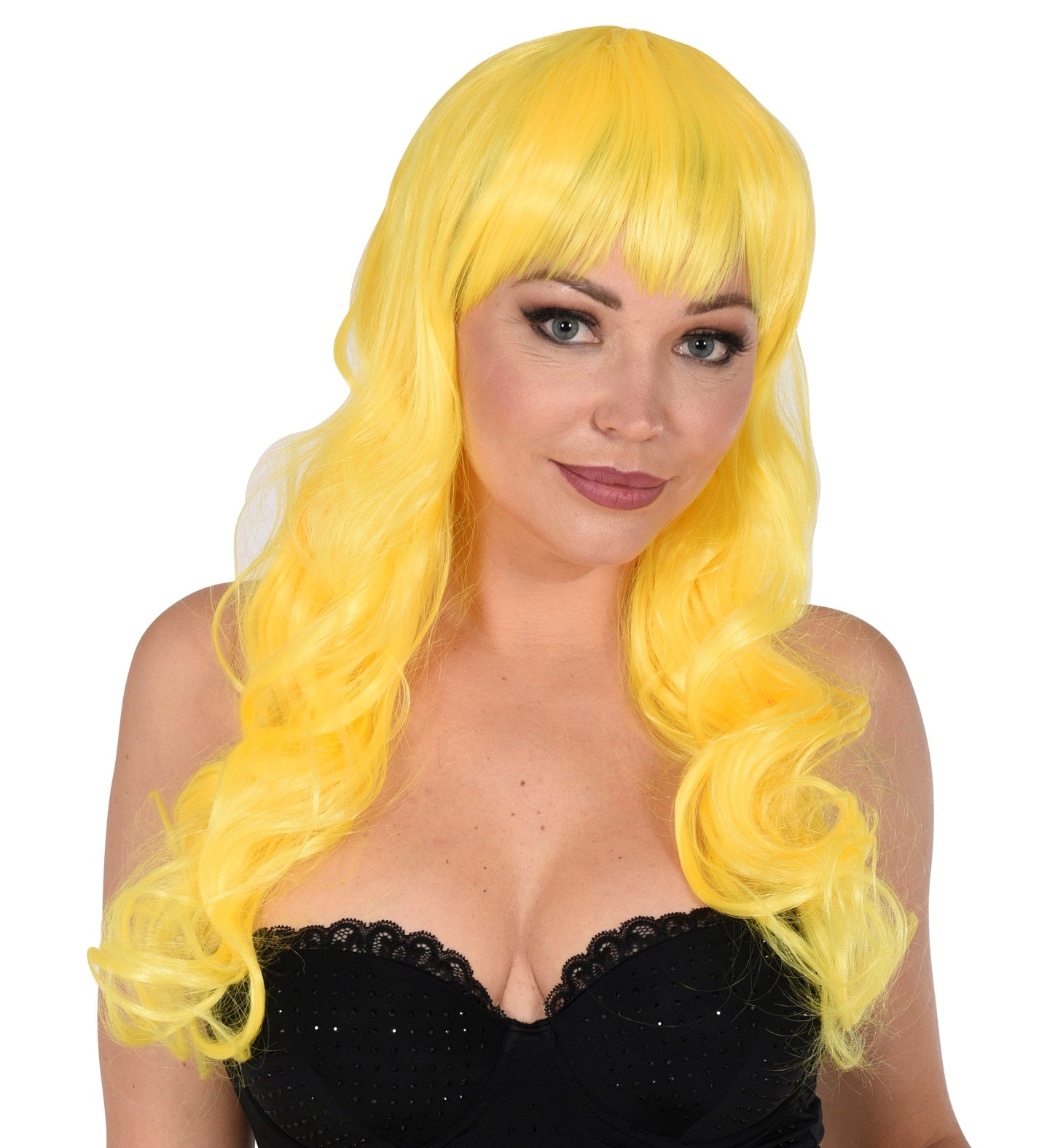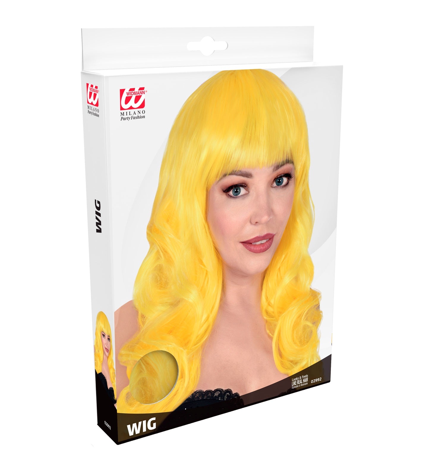 Gelbe Perücke mit Pony und langen lockigen Haaren