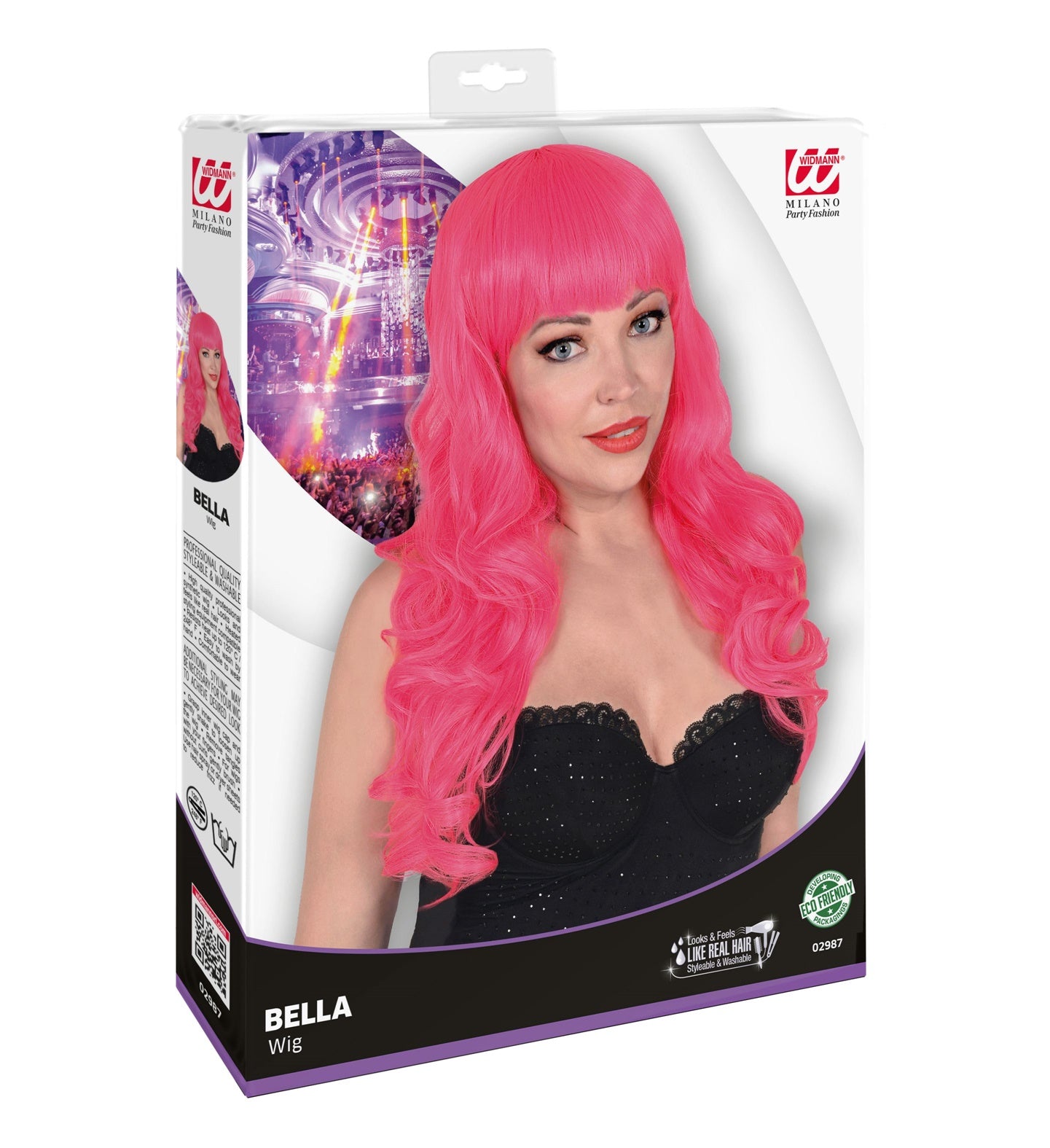 Rosa Perücke mit Pony und langen lockigen Haaren