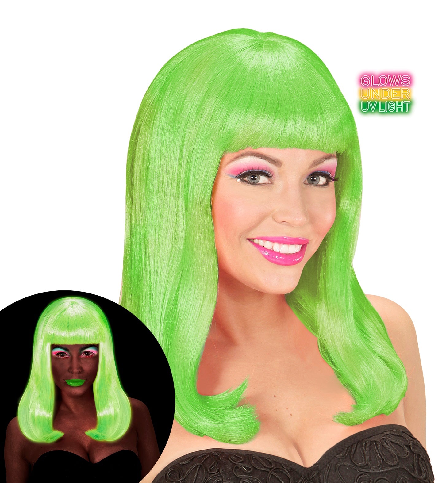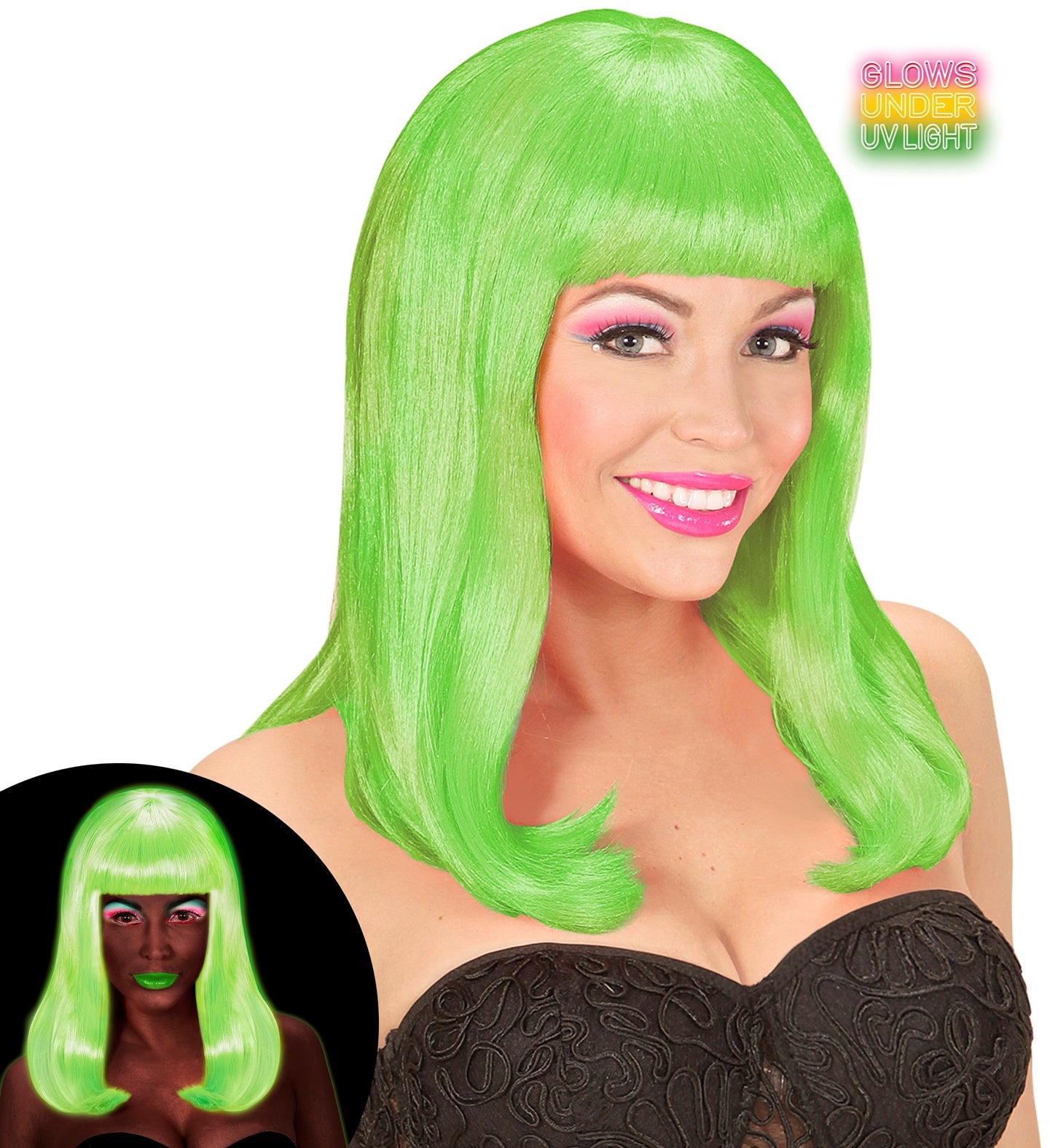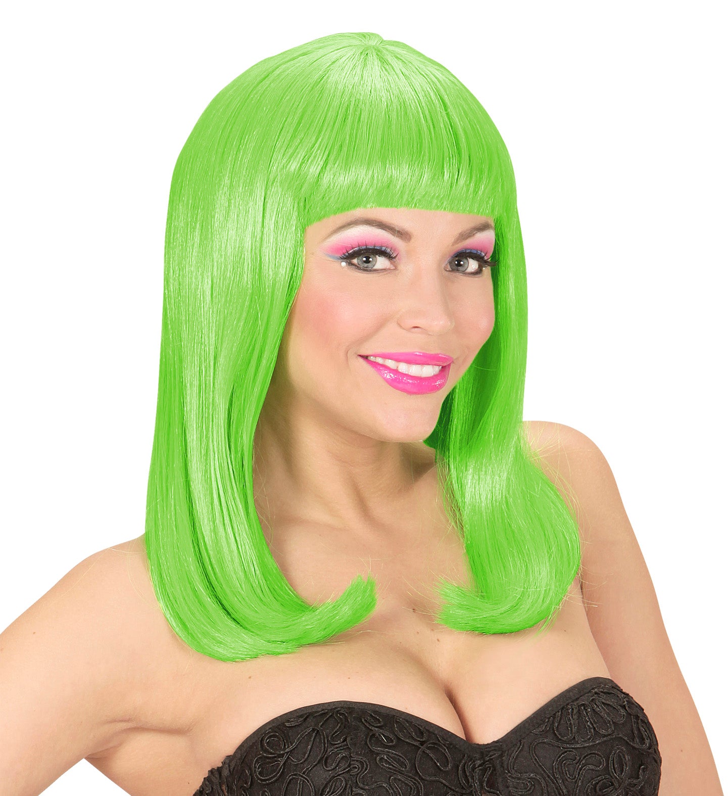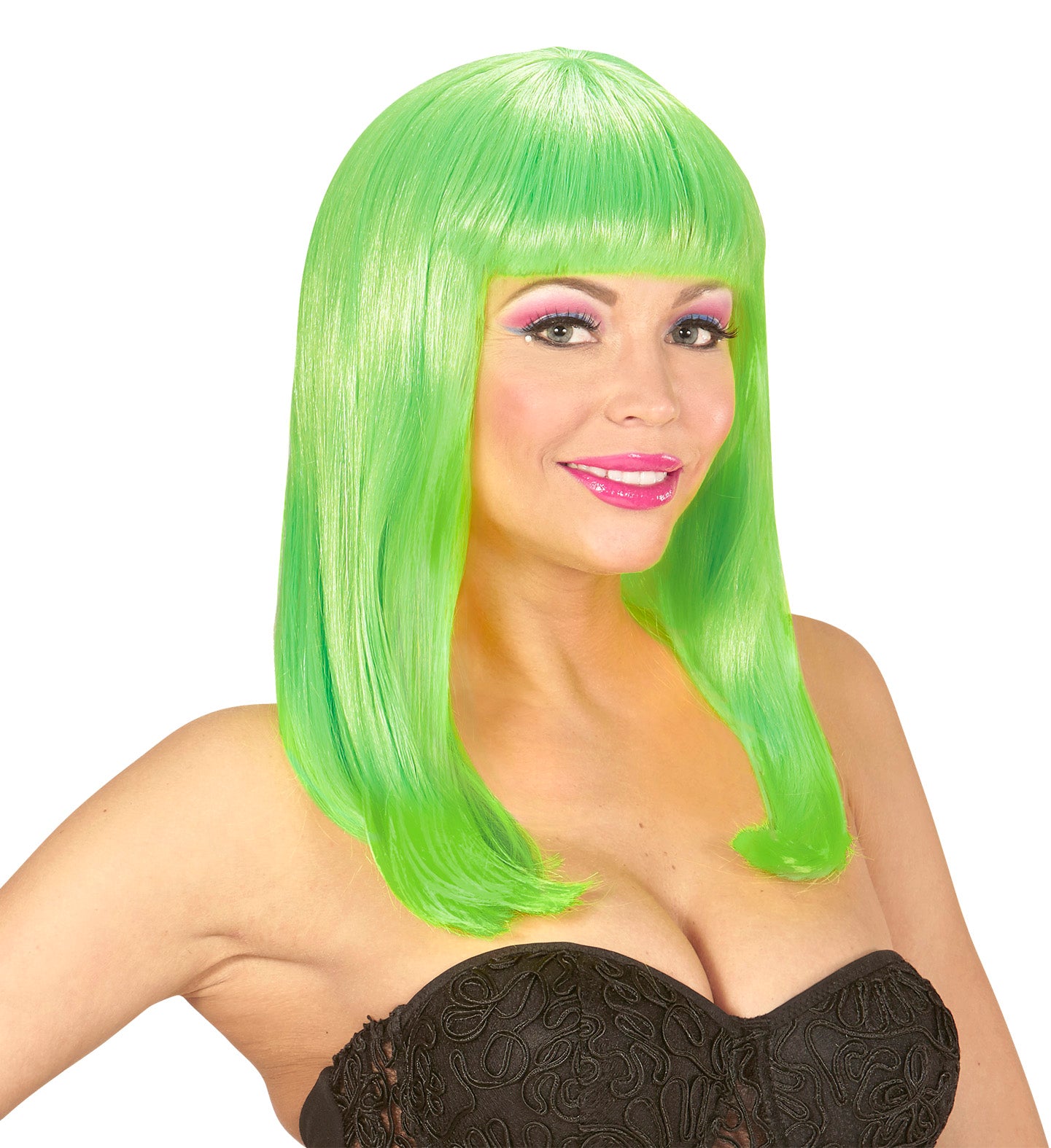 Neongrüne Perücke mit langen Haaren und Pony Mehr lesen