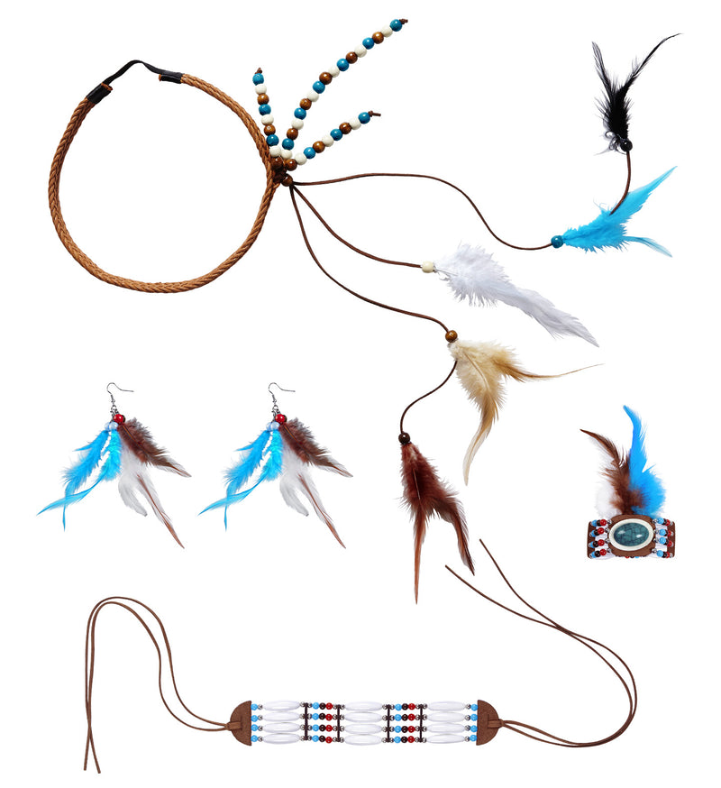Wunderschönes Indisches Manitou-Kostümset bestehend aus Stirnband mit Federn, Ohrringen, Halsband und Armband Mehr lesen