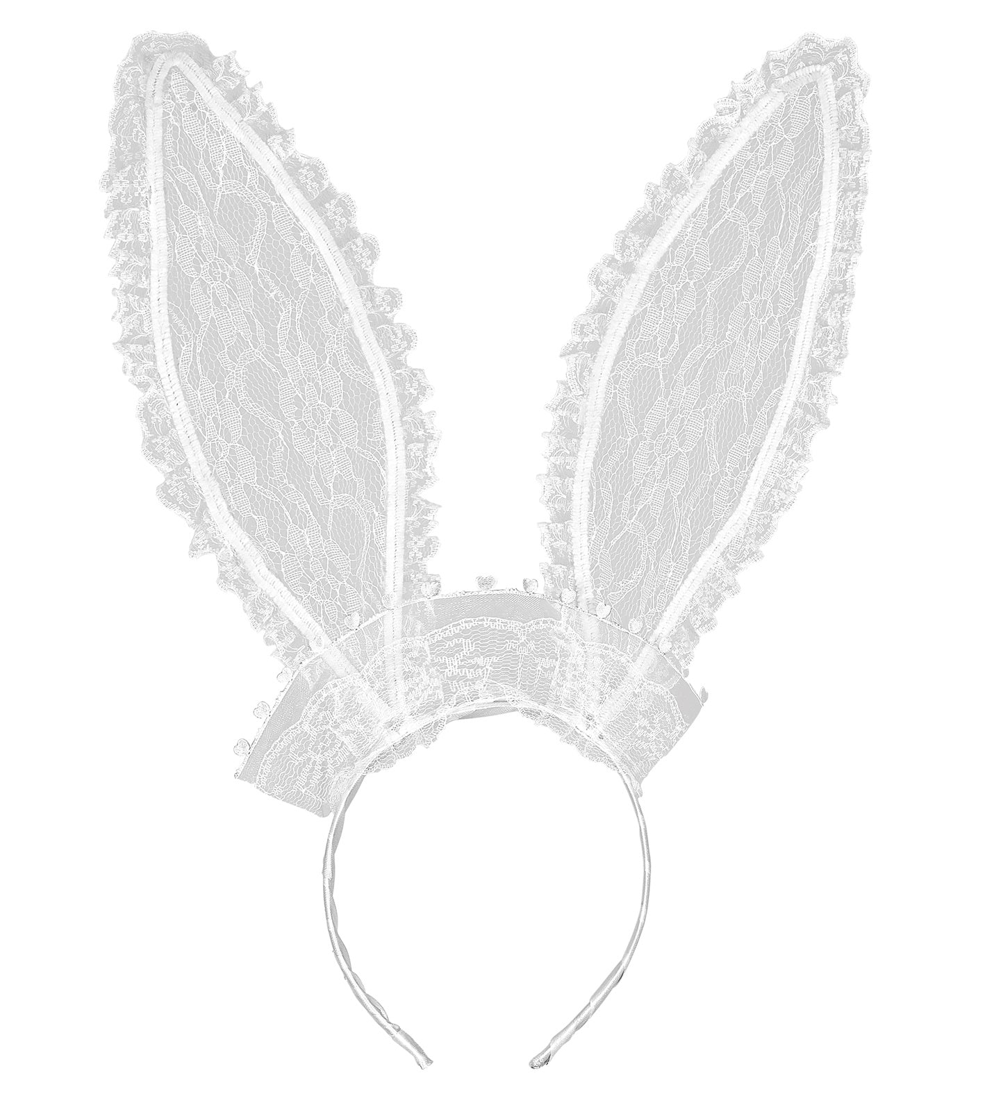Hasenohren mit weißer Spitze für Erwachsene. Diese Hasenohren aus Spitze sind für einen guten Tragekomfort auf einem Stirnband angebracht. Mehr lesen