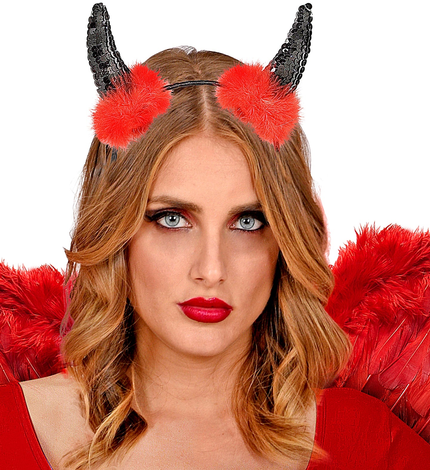 Diadem aus schwarzen Teufelshörnern mit rotem Marabu