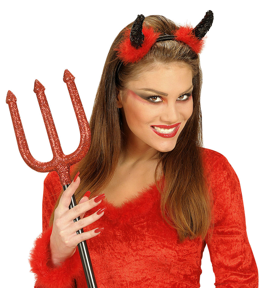 Tiara mit Teufelshörnern Luxuriöse Tiara mit schweren Teufelshörnern, besetzt mit Pailletten und wunderschönem roten Marabu. Dieses Halloween-Accessoire passt perfekt zu... Mehr lesen